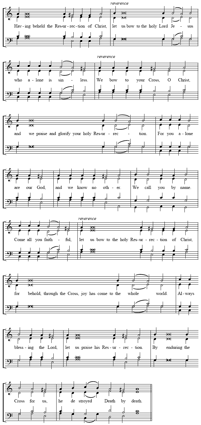 Kievan chant is usually sung in four-part harmony, which greatly enhances the musical effect of the melodic line. Here is a standard four-part setting from the MCI Paschal Matins book: