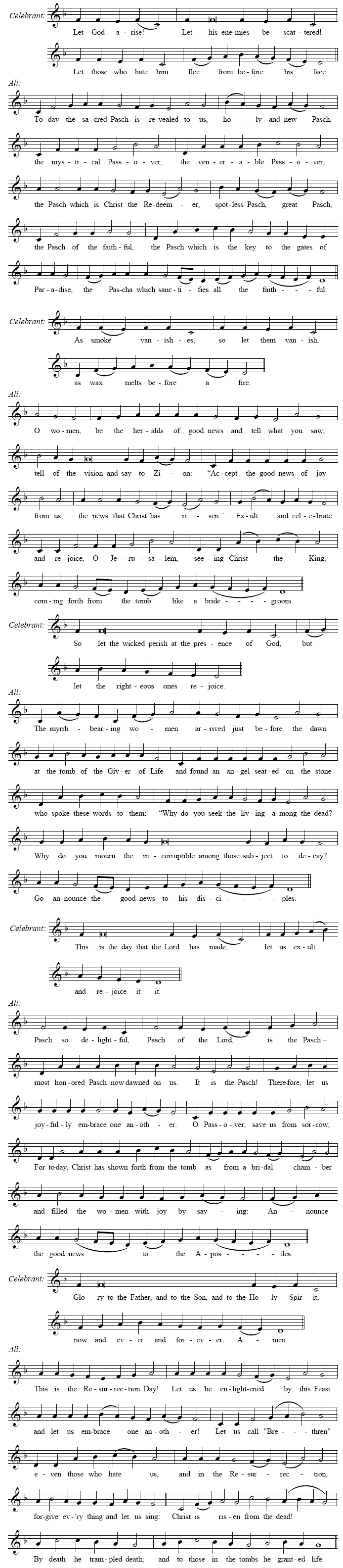 Listen to a recording of the Paschal stichera (with a slightly different text from that given below). This recording shows an example of a simple harmonization, and the use or two cantors, and alternation of hymns between men and women's voices.