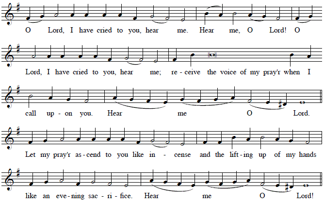 As the church is incensed and the lamps are lit, we sing the first two verses of Psalm 140 to the samohlasen sticheron melody in the Tone of the first sticheron; on Saturday evening, this will almost always be in the Tone of the Week. Here is how these verses are sung in Tone 1.