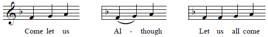 The notes of the intonation may be slurred together, or the first note repeated, so that the accent falls on the beginniing of the reciting tone.