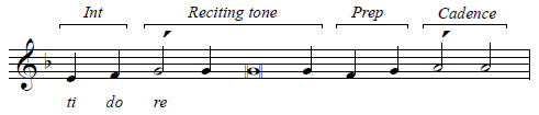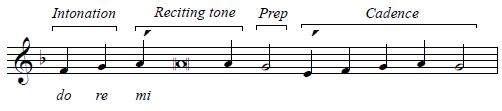 All four phrases of this melody have the same basic components: an intonation which begins the phrase; a reciting tone which is used to sing a variable amount of text; a preparatory note to signal the approach of the cadence; and the cadence itself which ends the phrase.