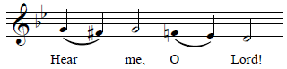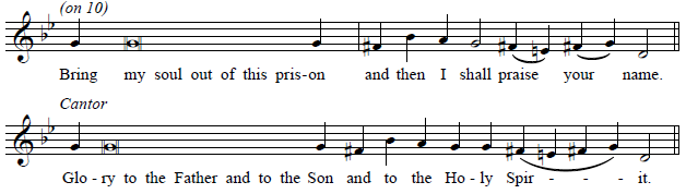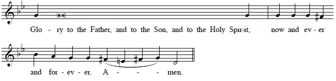 As usual, all text sung on the reciting pitch is in normal speech rhythm, and the two preparatory notes may be slurred together. The half notes of the cadence may also be slurred together, or the first half note divided into quarter notes, to fit the text.