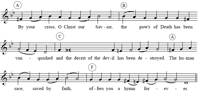 The melody consists of four parts, which we call A, B, C, and F (meaning final). For a longer sticheron, we repeat the A, B, and C phrases in order, as many times as necessary: