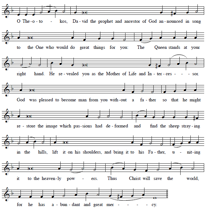 The last sticheron at the Lamplighting Psalms on an ordinary Saturday evening is called a dogmatikon, because it highlights the dogma or teaching of the Incarnation. Here is the tone 4 dogmatikon, set to the Tone 4 samohlasen melody. The verse is given, followed by the sticheron. Notice how each phrase flows into the next.