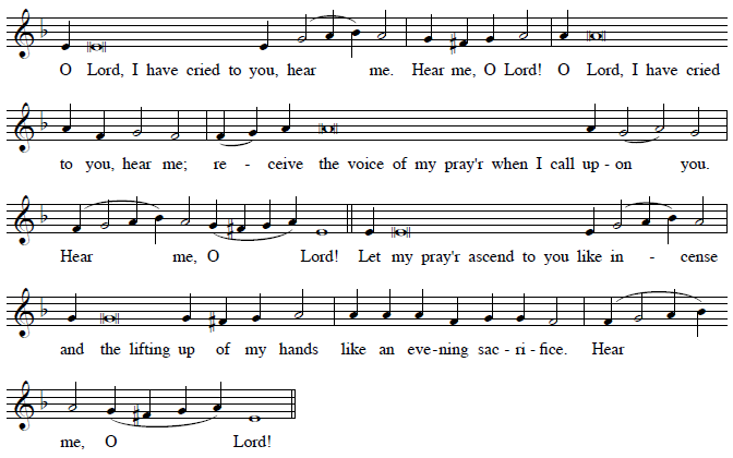 As the church is incensed and the lamps are lit, we sing the first two verses of Psalm 140 to the samohlasen sticheron melody in the Tone of the first sticheron; on Saturday evening, this will almost always be in the Tone of the Week. Here is how these verses are sung in Tone 4.
